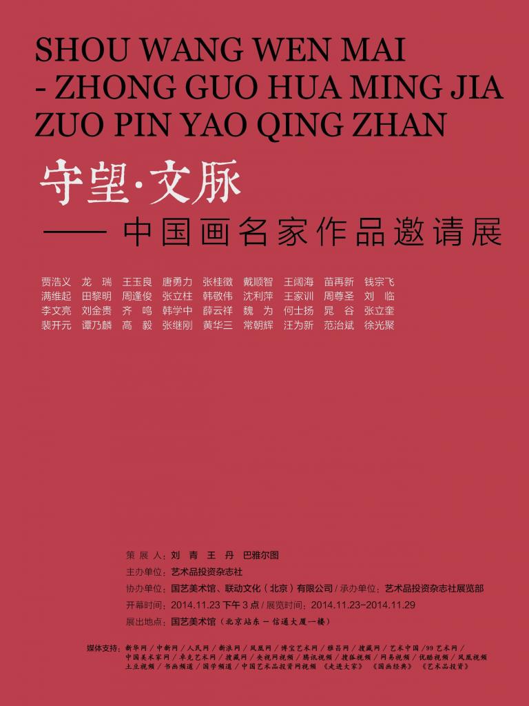 摘要: 『守望•文脉』—中国画名家作品邀请展 策 展 人:刘青·王丹·巴雅尔图 主办单位:艺术品投资杂志社 承办单位:艺术品投资杂志社展览部展览地点:国艺美术馆(北京站东-信通大厦1楼) 展览时间:2014年11月 ...